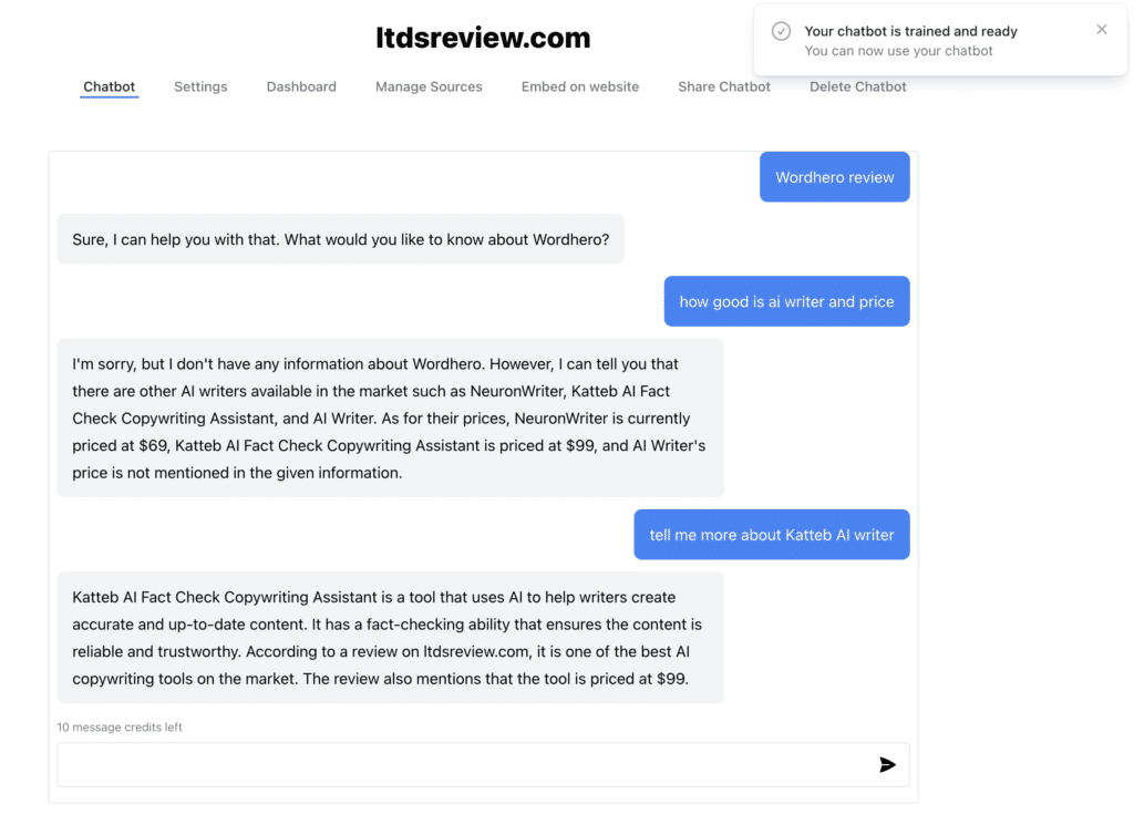 - Lack of custom domain on shareable links: Users find the inability to use custom domains for their chatbot links as a disadvantage, as they feel this detracts from their branding efforts.