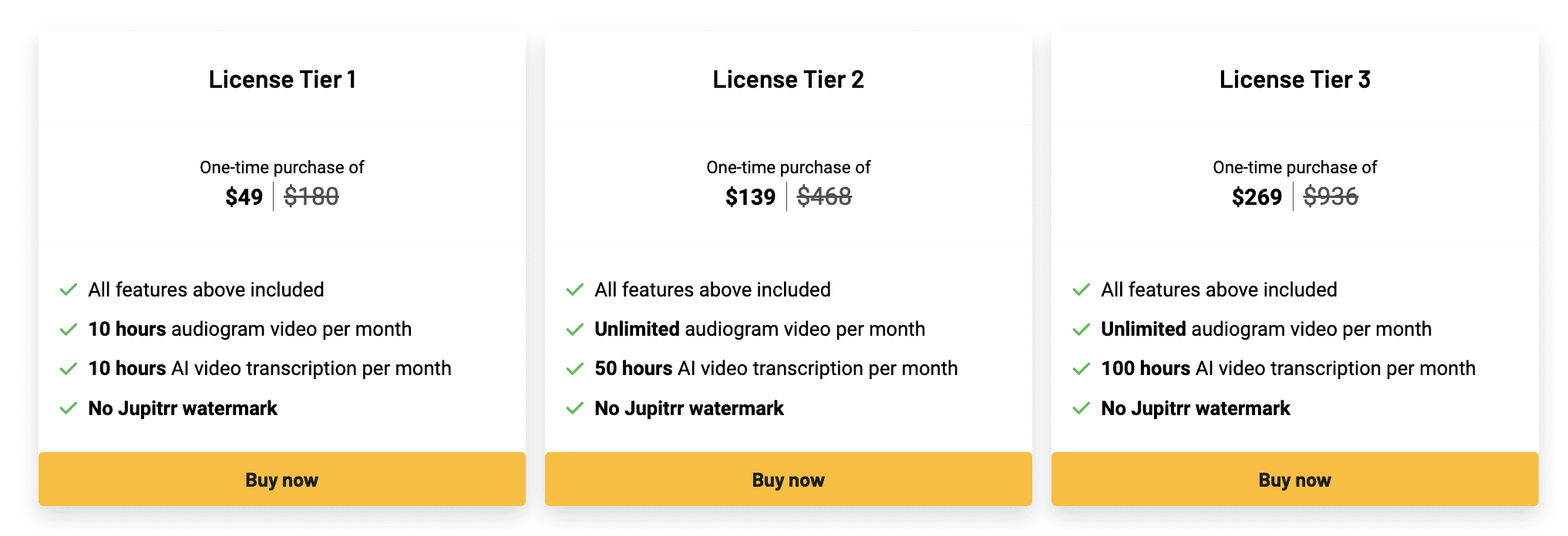 When it comes to pricing, Jupitrr offers three different license tiers to choose from. Each license tier comes with all the features mentioned above and has a one-time purchase fee.