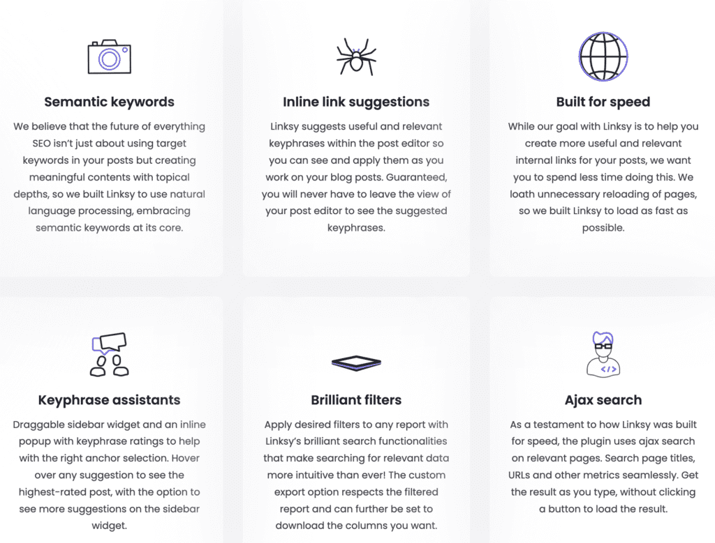 Linksy is an internal link-building plugin for WordPress that comes packed with a range of powerful features. One of its key features is its Smart link building capability, which enables users to quickly and easily link pages and posts together with relevant anchor text. This feature also helps to improve the overall SEO of your website by creating a solid interlinking structure. Another great feature is Anchor texts rating, which allows users to monitor and improve the quality of their anchor texts as they build internal links. Overall, Linksy’s key features make it an ideal choice for anyone looking to build a strong internal linking structure on their WordPress website.