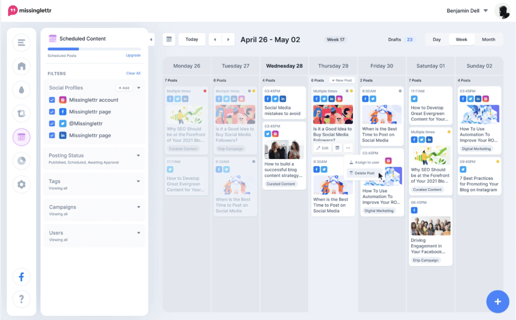 Efficient Content Scheduling: Missinglettr can prepare and schedule your social media content months in advance, freeing up your time to focus on other business operations.