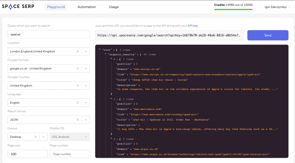 But don’t be intimidated by the API aspect if you’re new to it. SpaceSerp is designed to be user-friendly, so even someone as technologically challenged as “ol’ grandpa Joe” can figure it out. Simply fill out a few drop-down boxes on the dashboard, hit run, and voila! All that valuable Google SERP data is neatly organized in your preferred format, be it a spreadsheet, JSON, or any other format of your choosing.