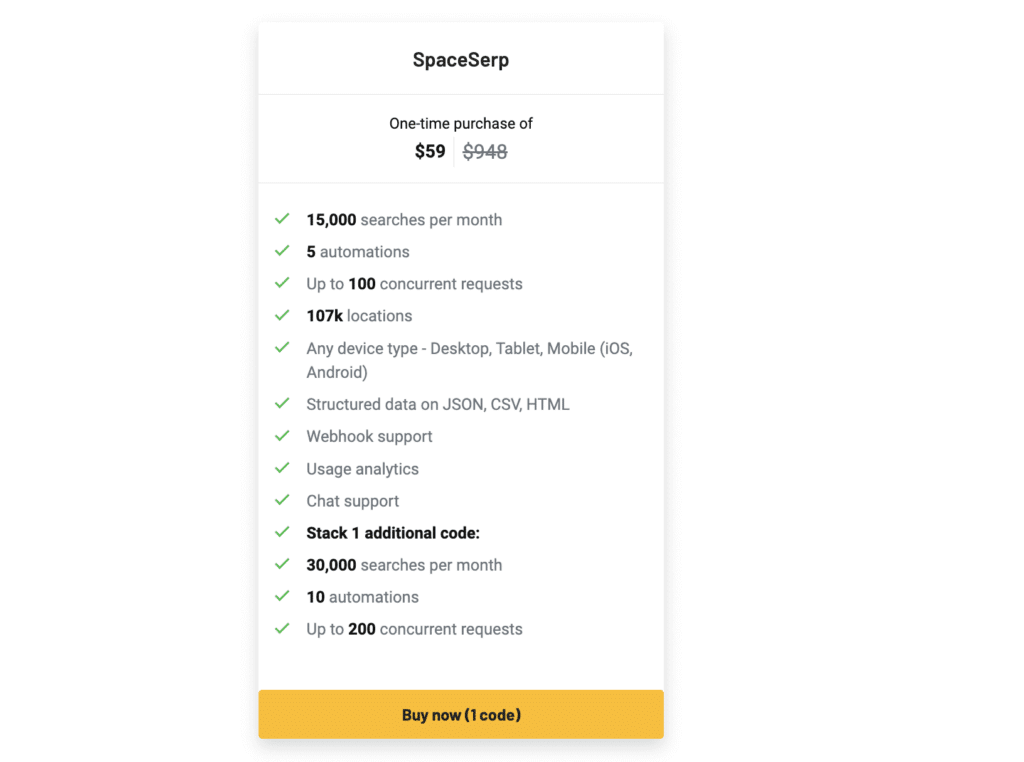 - If you choose the Stack 1 additional code, you’ll receive 30,000 searches per month, 10 automations, and the ability to make up to 200 concurrent requests.