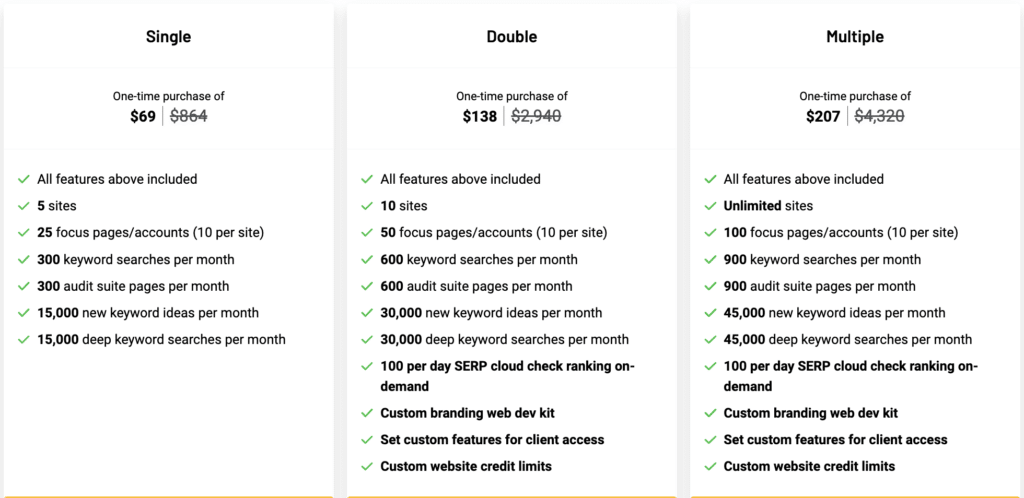 Plan | Price | Sites | Focus Pages/Accounts | Keyword Searches/Month | Audit Suite Pages/Month | New Keyword Ideas/Month | Deep Keyword Searches/Month | SERP Cloud Check Ranking On-Demand | Custom Branding Web Dev Kit | Set Custom Features for Client Access | Custom Website Credit Limits |