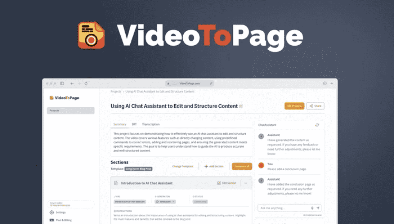 - Generate and Edit: VideoToPage’s AI generates text, allowing users to edit directly in a WYSIWYG editor with real-time assistance from an AI chatbot.