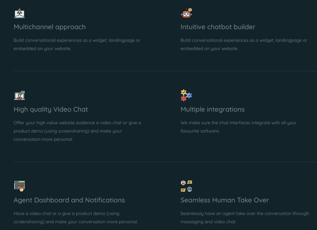 - The ability to deploy chatbots on various platforms, including as widgets, landing pages, or embedded on websites.